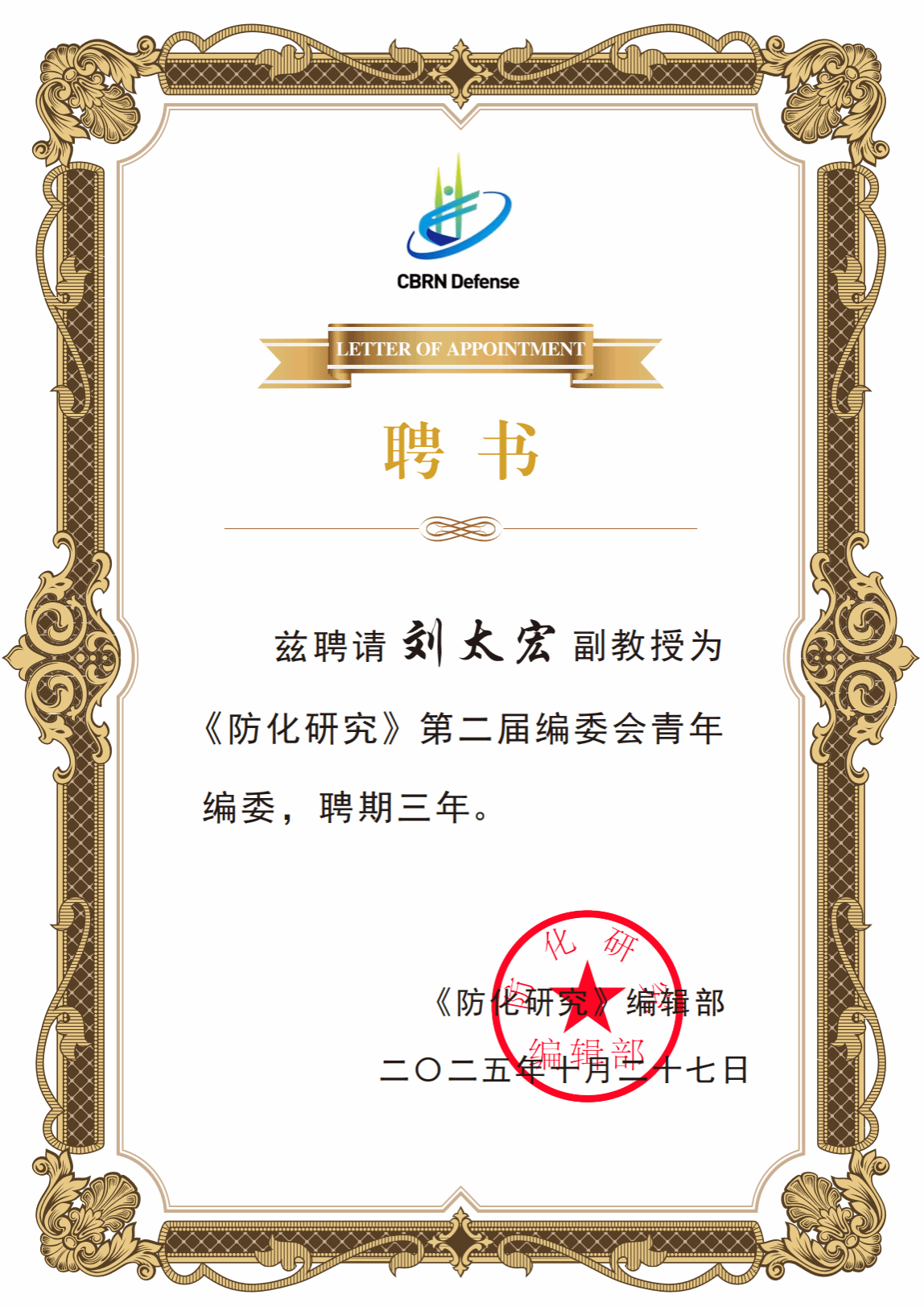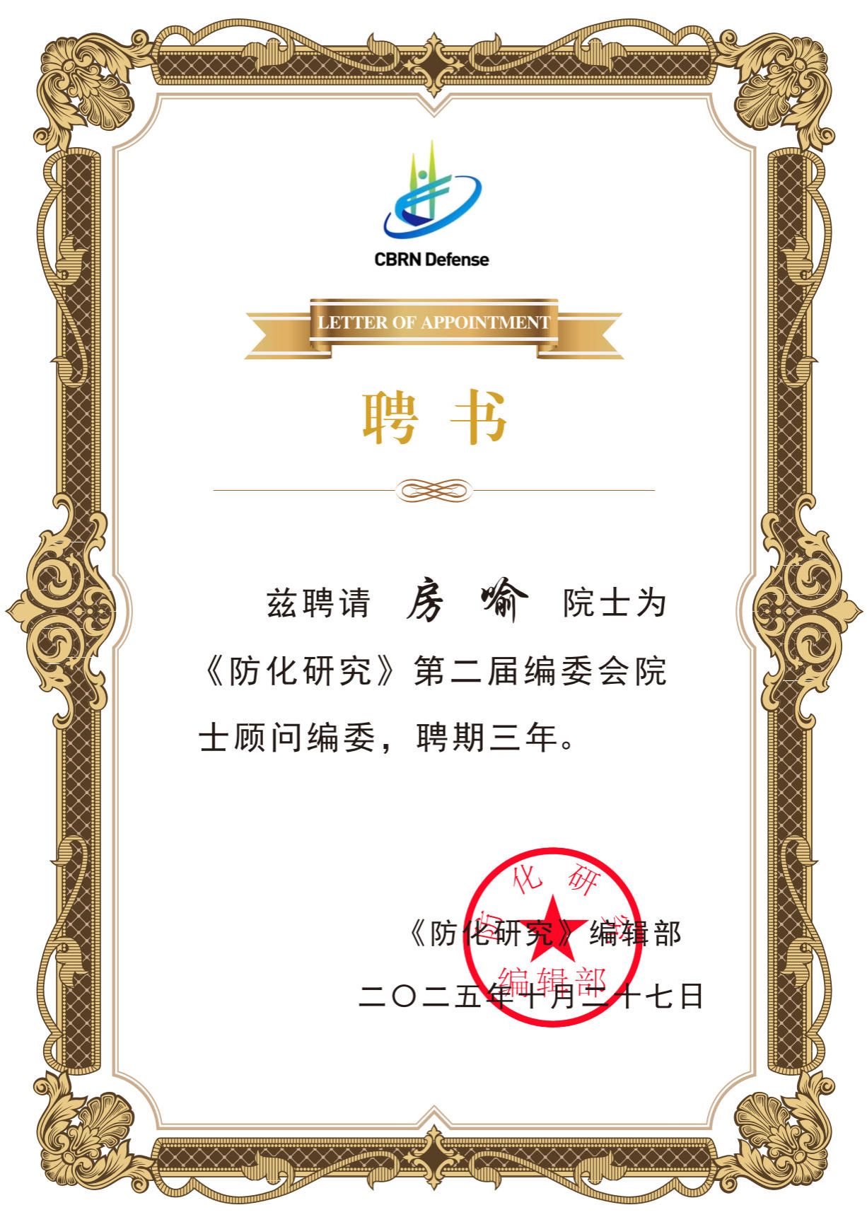 On November 1, 2025, the inaugural meeting of the second editorial board of CBRN Defense was held online, during which Prof. Fang Yu was appointed as an academician advisor to the second editorial board, while Assoc. Prof. Liu Taihong was appointed as a young editorial board member, both for a three-year tenure.