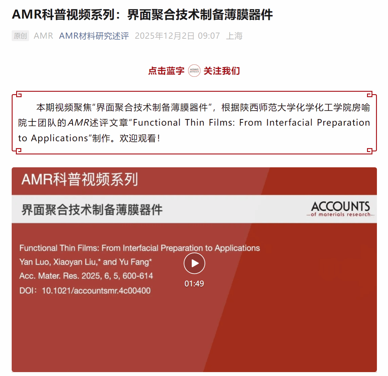 Recently, Accounts of Materials Research produced a science popularization video titled “Interfacial Polymerization Technology for Fabricating Thin-Film Devices” based on the AMR review article “Functional Thin Films: From Interfacial Preparation to Applications” by Prof. Fang Yu’s team from the Institute of New Concept Sensors and Molecular Materials at Shaanxi Normal University, which was released on the official WeChat account “AMR Materials Research Review”.