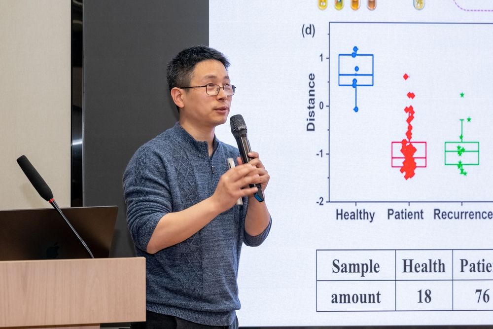 Prof. Wu Weiwei began by explaining the working principles of electronic noses and the methodology behind breath diagnosis research. He then detailed his team’s preliminary work addressing bottlenecks in artificial olfactory receptors for electronic noses, including developments in conductive polymer VOC sensor arrays, methods for suppressing humidity interference in sensors, passive VOC sensor arrays using polymer composite films, and clinical urine odor detection for bladder cancer, as well as the team’s efforts in electronic nose system design and manufacturing.