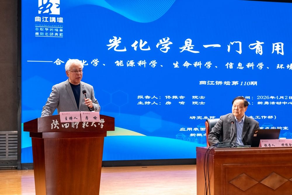 On the morning of April 2, Tong Zhenhe delivered a report titled “Photochemistry: A Useful Science — Photochemistry in Synthetic Chemistry, Energy Science, Life Sciences, Information Science, Environmental Science, and Public Safety” at the 110th session of SNNU “Qujiang Forum”.
