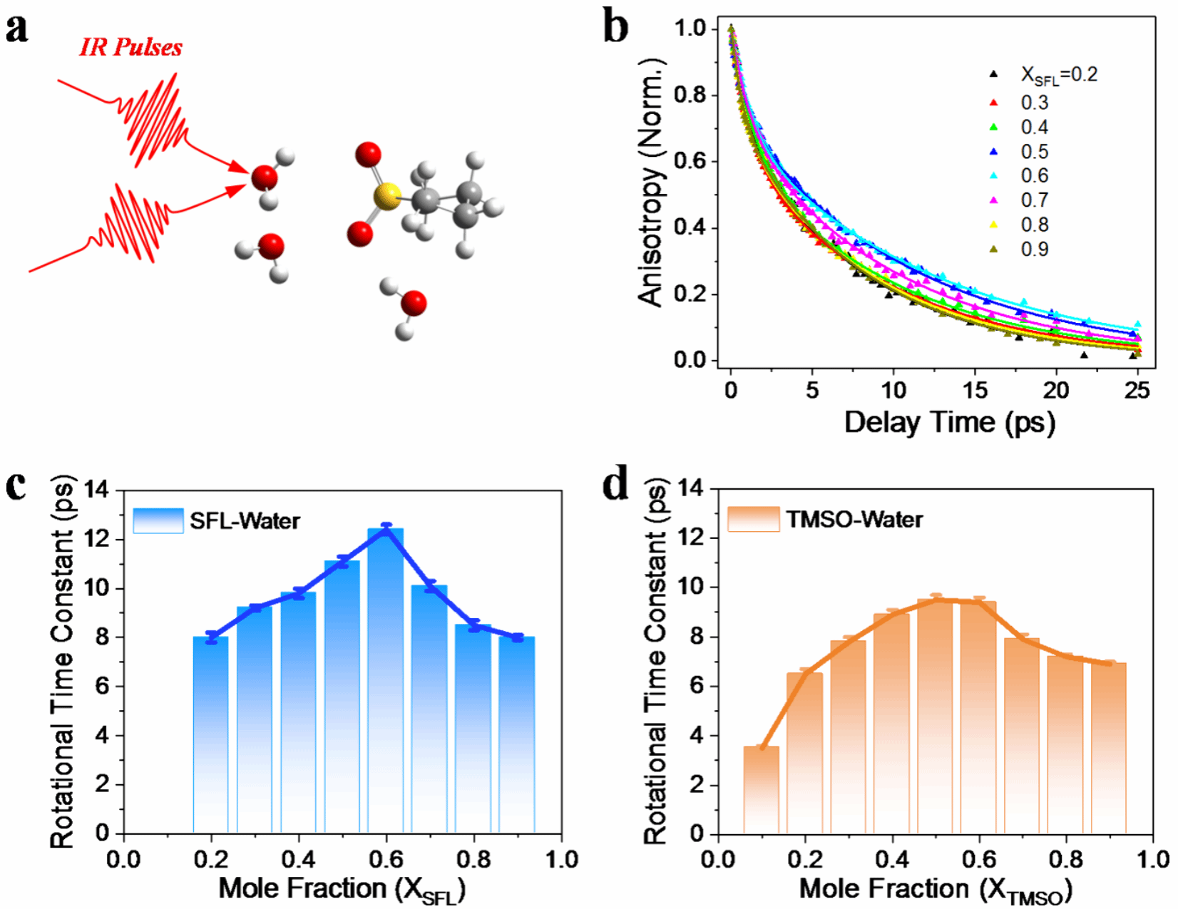 Fig. 1. Ultrafast infrared spectroscopic characterization of hydrogen-bond dynamics of water molecules in SFL/ H2O and TMSO/ H2O mixtures at different concentrations.