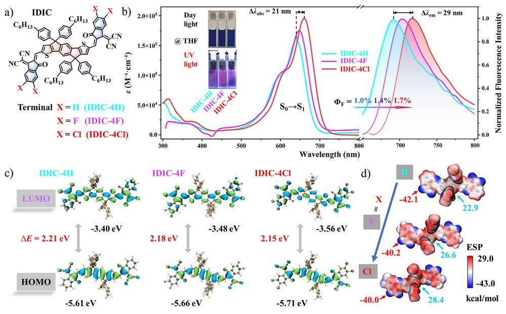 Figure 1. Molecular structures and steady-state spectra of the three IDIC chromophores, along with their frontier molecular orbital distributions and ESP maps.