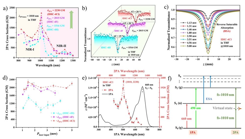 Versatile modification of conjugated chromophores is crucial for pronounced intramolecular charge transfer (ICT) and favorable transition diploe moments in nonlinear optics. Herein, the resultant correlation between the terminal substitution effects of IDIC chromophores [bis(1,1-dicyanomethylene-3-indanonyl)-terminated-indacenodithiophene] and their photophysical properties was comparatively investigated. Halogenated IDIC chromophores, namely IDIC-4F and IDIC-4Cl, feature the quadrupolar acceptor-donor-acceptor structural motifs and exhibit significant spectral red-shifts in comparison with the parent counterpart of IDIC-4H. It implies enhanced electron-withdrawing ability of the acceptor achieved by the F/Cl substituents. Characterized by the typical open-aperture Z-scan measurements, IDIC-4Cl presents a two-photon absorption (2PA) cross-section (δ2PA) maximum of 2230 GM (1 GM ≡ 10−50 cm4⋅s⋅photon−1⋅molecule−1) at the specific wavelength of 1010 nm in the NIR-II spectral region, which is significantly higher than that of IDIC-4H (δ2PA = 1516 GM). Electron-withdrawing terminal halogenation is proved to be responsible for the enhanced 2PA capacities. DFT calculations corroborate that the frontier orbital energy levels as well as the bandgaps decrease following the electron-withdrawing trend of H→F→Cl. Ultrafast transient absorption spectroscopies further reveal that halogenated IDIC chromophores possess reactively low excited-state energy levels and strong ICT effects, which contribute to improving their 2PA capabilities. Leveraging these features, this study deepens the understanding of terminal halogenation effect on the transition dynamics and nonlinear 2PA properties of the quadrupolar IDIC chromophores.