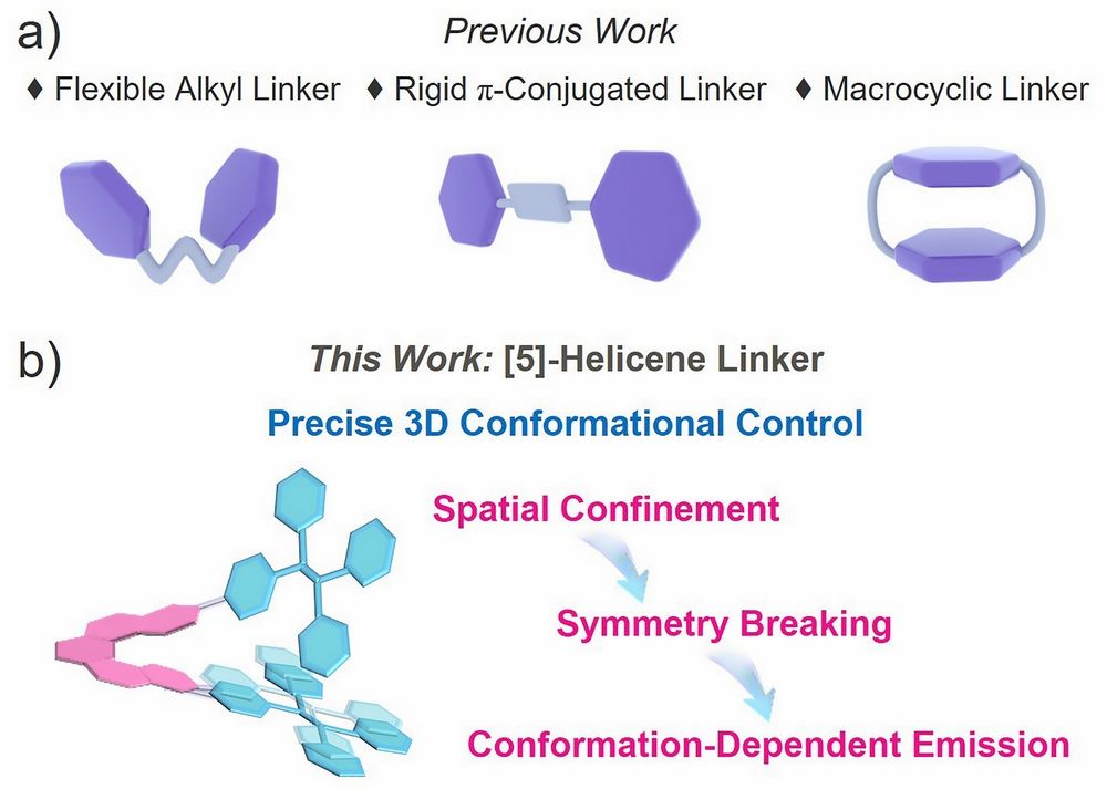 The photophysical properties of organic luminescent materials are strongly influenced by molecular conformation, intramolecular motion, and solid-state packing. In aggregation-induced emission (AIE) systems, restricting intramolecular rotations and vibrations is particularly important because it helps suppress nonradiative decay and improve emission efficiency. Dimeric systems, with their well-defined structures and clear interchromophore interactions, have therefore been widely used as model systems for understanding conformation-property relationships. However, conventional linkers, such as flexible chains, rigid aryl groups, and macrocycles, can only partially regulate chromophore distance and coupling, and often do not provide sufficient control over three-dimensional molecular conformation. In this context, [5]helicene is especially attractive because of its rigid, chiral, and sterically demanding structure. It can act not only as a linker, but also as a conformational editor, offering a useful strategy for tuning both luminescence and chiroptical properties.
