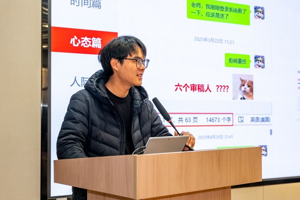 赵智豪老师回顾了自己硕博连读到博士后的科研经历,以及其中的心路历程,强调了前期深度思考、研究方向聚焦以及成果连续积累的重要性,提出科研应避免盲目试错、及时分析数据调整方案并注重效率。随后,他还分享了论文投稿经历以及求职和生活中遇到的困难和转机、选择与思考,指出应不断提升自身能力,注重身心成长,进行自身纵向对比。