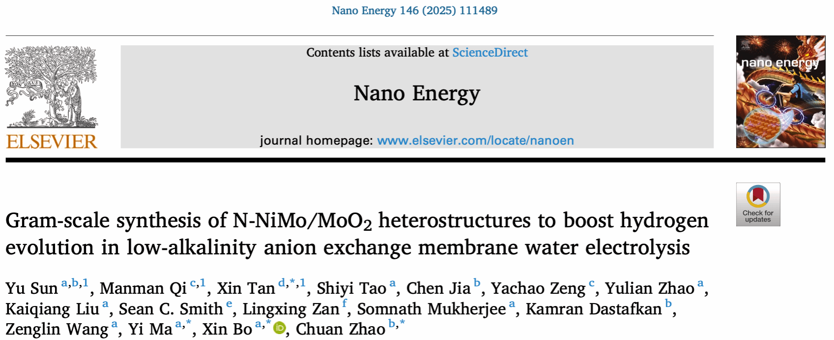 Yu Sun1,2, #, Manman Qi3, #, Xin Tan4, #, *, Shiyi Tao1, Chen Jia2, Yachao Zeng3, Yulian Zhao1, Kaiqiang Liu1, Sean C. Smith5, Lingxing Zan6, Somnath Mukherjee1, Kamran Dastafkan2, Zenglin Wang1, Yi Ma1, *, Xin Bo1, *, and Chuan Zhao2, *, Nano Energy, 2025, 146, 111489. DOI: 10.1016/j.nanoen.2025.111489