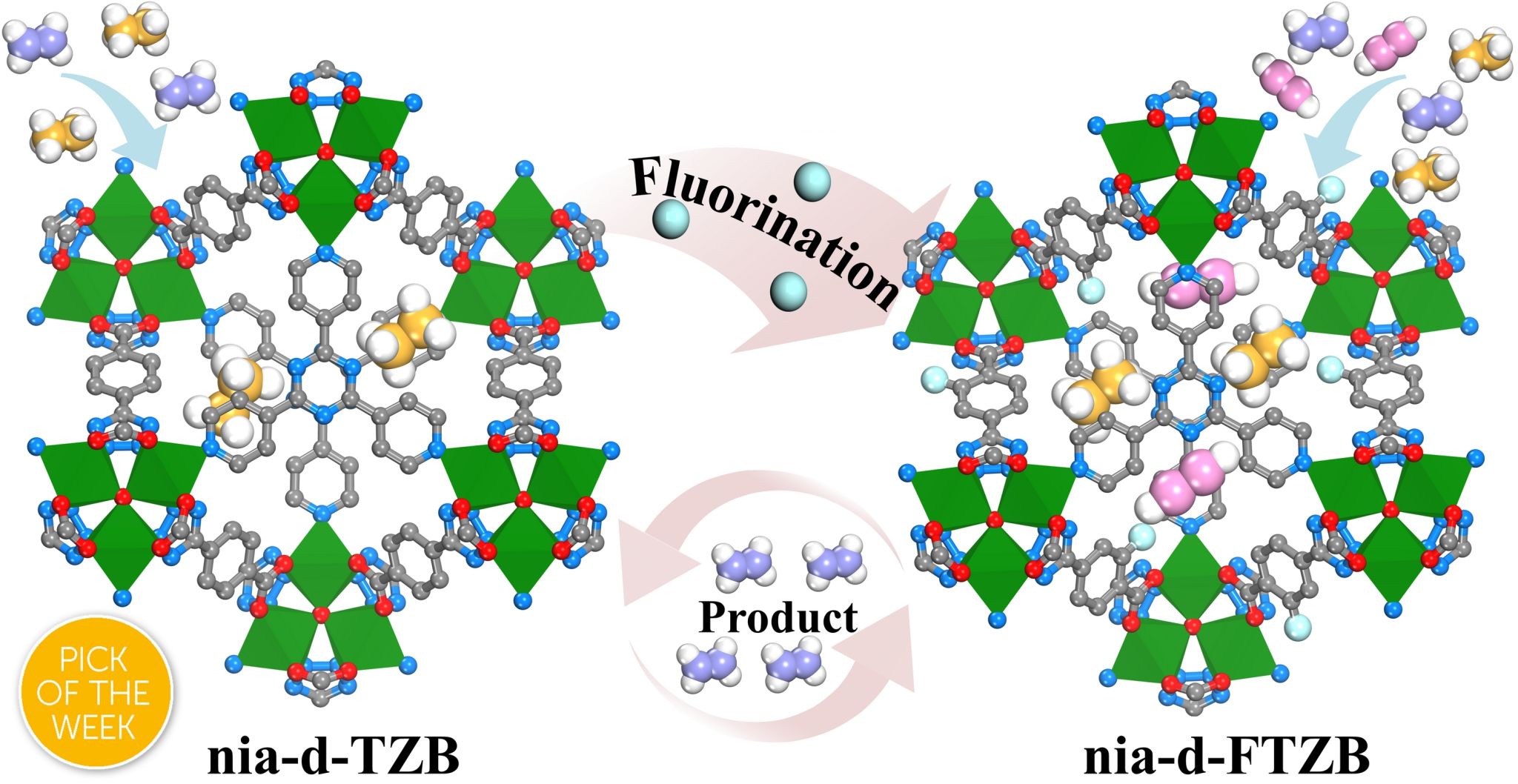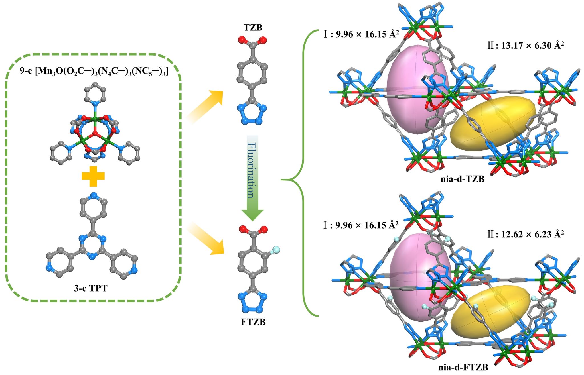利用网格化学和混合配体策略,我们使用相同的金属源和一个三齿三嗪配体,以及一个带有羧酸和四唑基的异功能线性配体(TZB)和氟化配体(FTZB),合成了两例具有nia-d拓扑的三核锰基MOF结构:nia-d-TZB和nia-d-FTZB。nia-d-TZB优先吸附乙烷,可从乙烷/乙烯二元混合物中一步提纯乙烯;nia-d-FTZB则同时优先吸附乙炔和乙烷,实现从乙炔/乙烷/乙烯三元混合物中一步获得聚合级乙烯。
