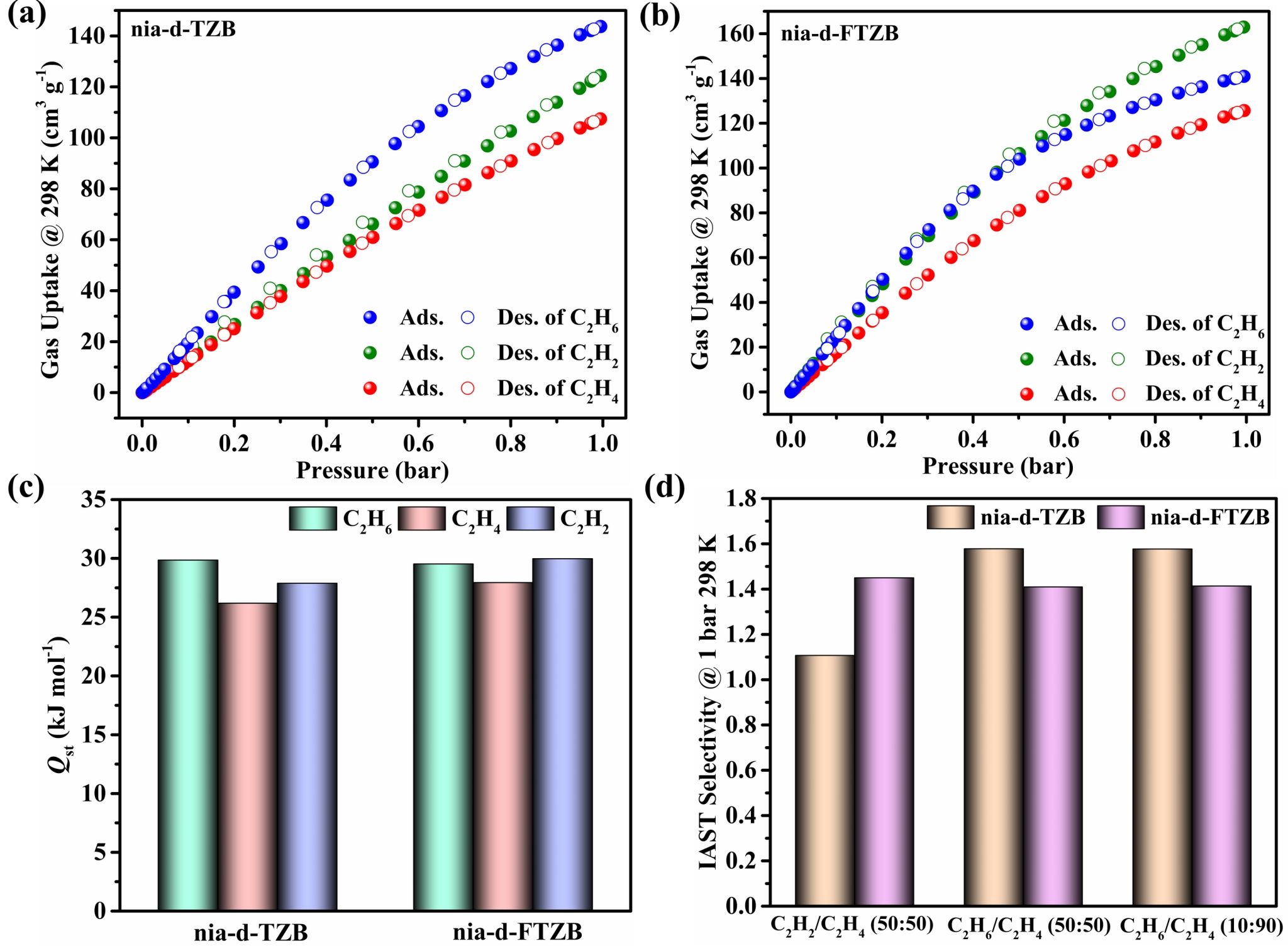 图2 (a) nia-d-TZB在298 K时的C2H2、C2H6、C2H4吸附等温线;(b) nia-d-FTZB在298 K时的C2吸附等温线;(c) nia-d-TZB和nia-d-FTZB的C2H2、C2H6和C2H4的Qst;(d) 298 K和1 bar条件下,nia-d-TZB和nia-d-FTZB对C2H2/C2H4 (50/50, v/v)和C2H6/C2H4 (50/50, 10/90, v/v)的选择性