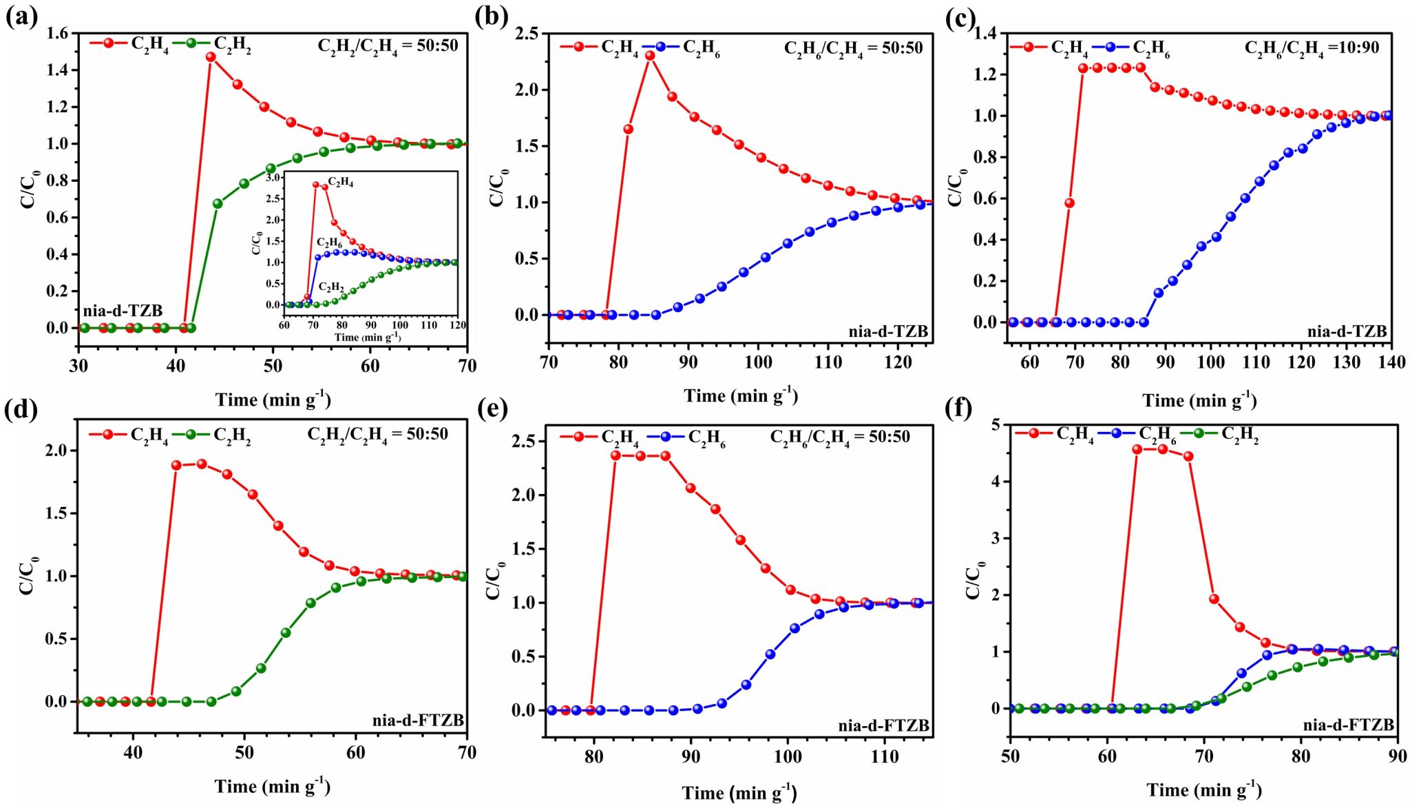 图3 (a) C2H2/C2H4 (50/50, v/v)和C2H6/C2H4/C2H2 (1/1/1, v/v/v), (b) C2H6/C2H4 (50/50, v/v)和 (c) C2H6/C2H4 (10/90, v/v)在298 K, 1 bar下的总气量为1.0 mL min-1时nia-d-TZB的穿透曲线;(d) C2H2/C2H4 (50/50, v/v), (e) C2H6/C2H4 (50/50, v/v), (f) C2H6/C2H4/C2H2 (1/1/1, v/v/v),总气量1.0 mL min-1时,nia-d-FTZB的穿透曲线