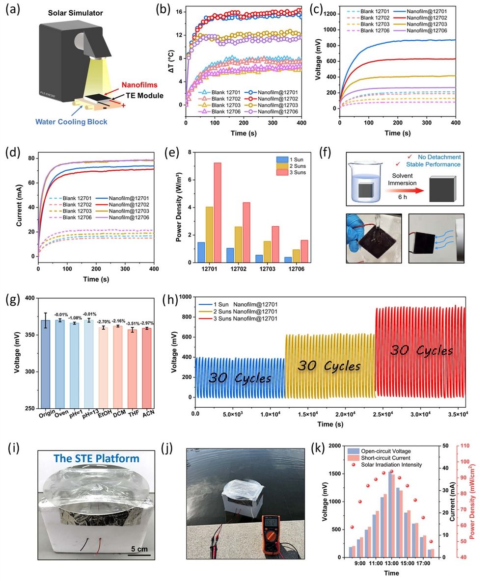 针对这一关键界面难题,本研究成功开发了一种在潮湿空气/二甲基亚砜界面合成的自粘性纳米薄膜。该薄膜厚度仅55–60纳米,具备宽光谱吸收与快速光热响应特性,其分子结构中的亚胺基团与纳米级厚度赋予其与多种基底(包括热电模块)的强效自粘附能力,并能耐受极端pH、水冲洗、热冲击及有机溶剂浸泡,展现出卓越的环境稳定性。基于此,研究团队构建了新型STE器件,在1倍太阳光照射下实现了1.46 W m⁻²的高实际功率输出,且经历90次循环后未出现性能衰减。基于此搭建的装置,能够漂浮在湖面上实现连续电能输出,成功验证其实际应用潜力。本研究为解决STE转换中的长期界面瓶颈提供了创新性解决方案,并为发展高性能、长寿命的能量收集器件开辟了新途径。