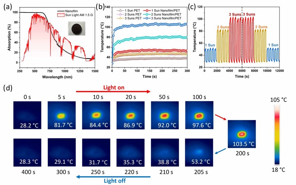 图1. (a)纳米薄膜的吸收光谱与太阳光谱的对比。(b-d)纳米膜的光热转换能力测试。