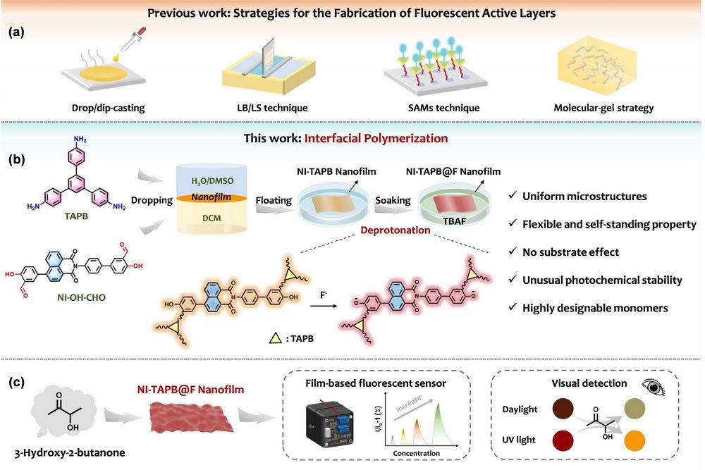 3-羟基-2-丁酮(3H2B) 是单核细胞增生李斯特菌的关键气态代谢物、一种潜在的肺癌生物标志物,也是一种广泛使用的食品风味剂,因此对其进行实时监测的需求日益凸显。本研究设计了一种水杨醛功能化的1,8-萘酰亚胺衍生物(NI-OH-CHO),并将其与1,3,5-三(4-氨基苯基)苯(TAPB)在液/液界面反应,制备了NI-TAPB荧光纳米薄膜。该薄膜经去质子化后(NI-TAPB@F),对3H2B表现出可逆且前所未有的荧光响应。